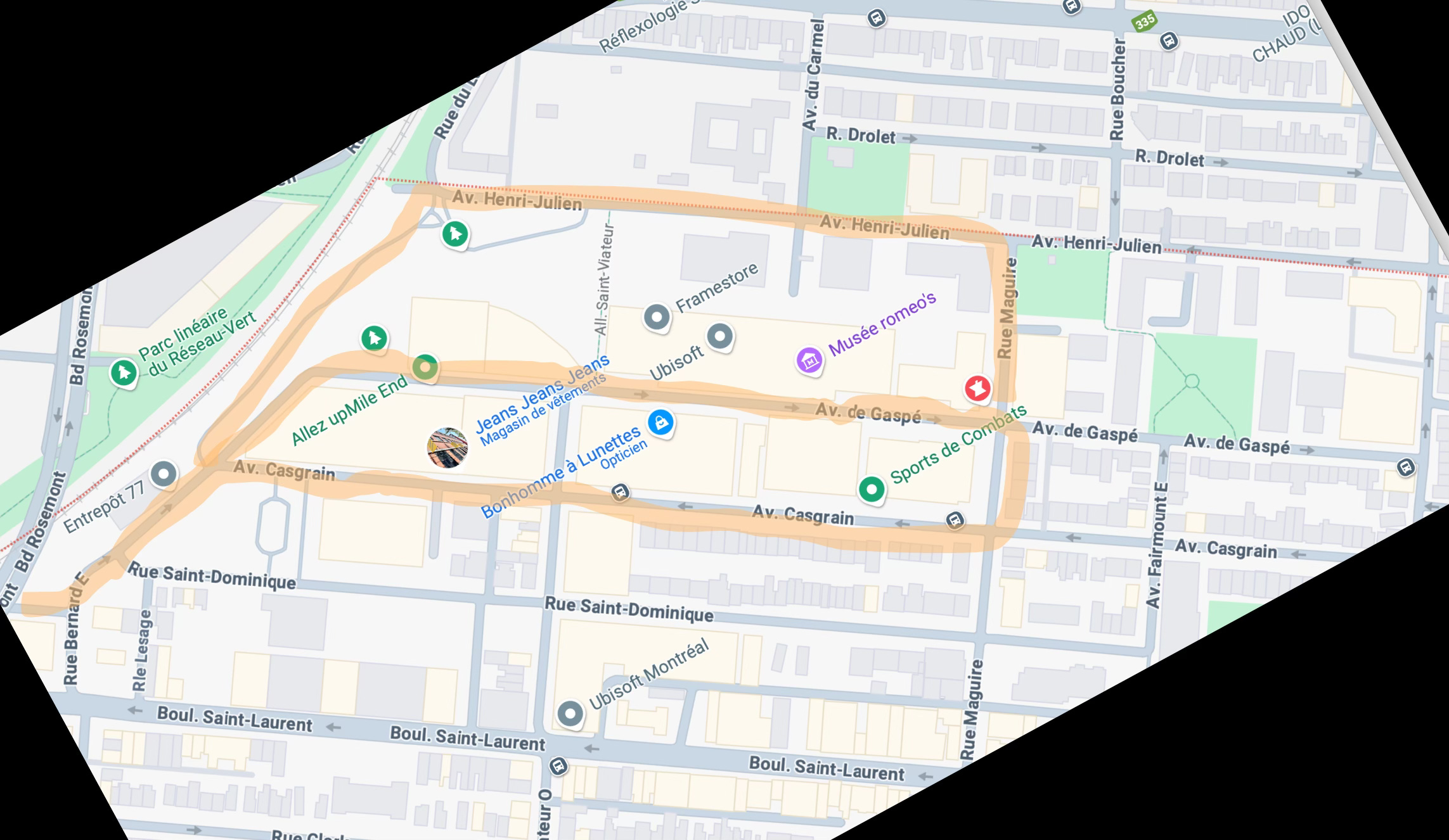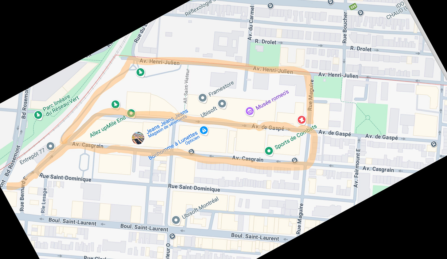 Il y a un coin un peu caché du Mile-End, mais bien connu des travailleurs d’Ubisoft et autres start-up québécoises. Je l’ai identifié sur la carte en changeant l’orientation. Vous passerez devant de jolis parcs et vous verrez comment bien des travailleurs et résidents du quartier prennent un raccourci illégal en traversant le chemin de fer. Dans ce coin caché, vous trouverez: