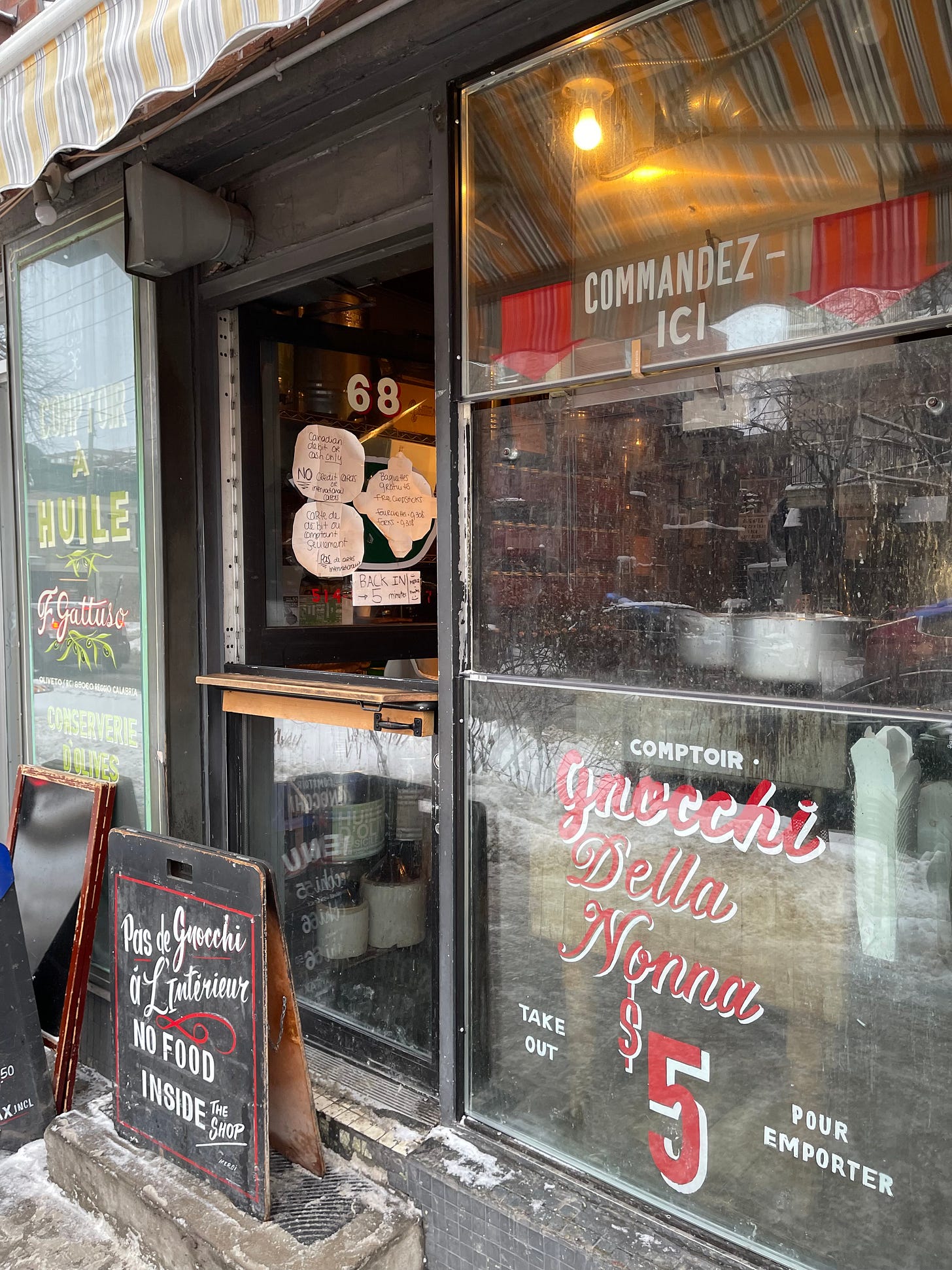 🌟 Drogheria fine. Par contre, une fois sur deux, quand je suis dans le Mile-End, j’achète les gnocchis à $5 de la Drogheria fine. C’est un comptoir qui donne sur la rue. On les mange avec des baguettes (on peut aussi demander une fourchette).